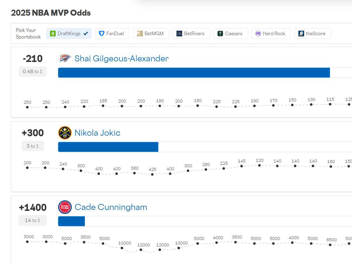 雷霆的強勢發揮與SGA的個人能力讓MVP的天平再度朝着亞歷山大傾斜,目前SGA的MVP賠率是斷崖領先-210,約基奇+300第二。