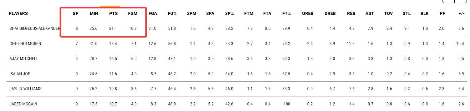亞歷山大自復出後雷霆未嘗敗績,他登場的8場比賽場均35.6分鐘,拿到31.1分8助攻4.3籃板2.1搶斷1蓋帽,命中率51.8%,三分命中率38.2%,正負值+53。
