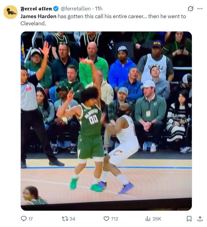 哈登疼得倒地不起,裁判沒有任何表示,雄鹿這邊都直接下快攻了,可哈登輕傷不下火線。哈登就帶着腳踝傷勢鏖戰了33分30秒。