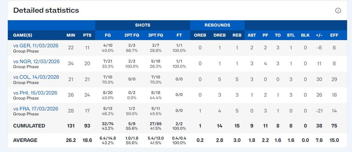 姜怡瑟五場比賽拿到93分是D組第一,場均26.2分鐘,拿到18.6分3籃板1.8助攻1.6搶斷,命中率43.2%,三分命中率41.5%,場均命中5.4個三分球。