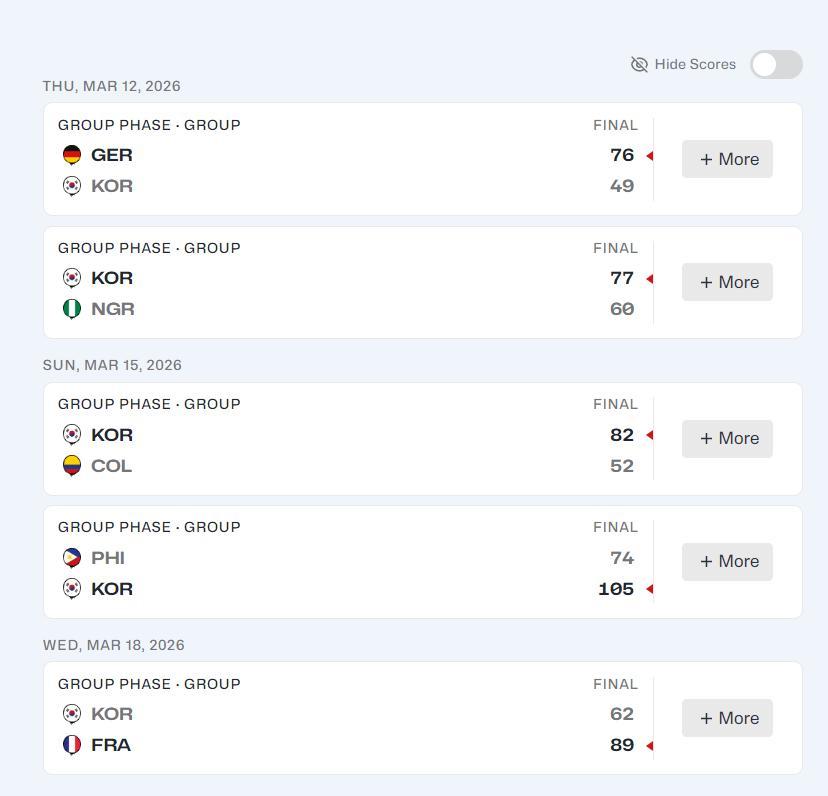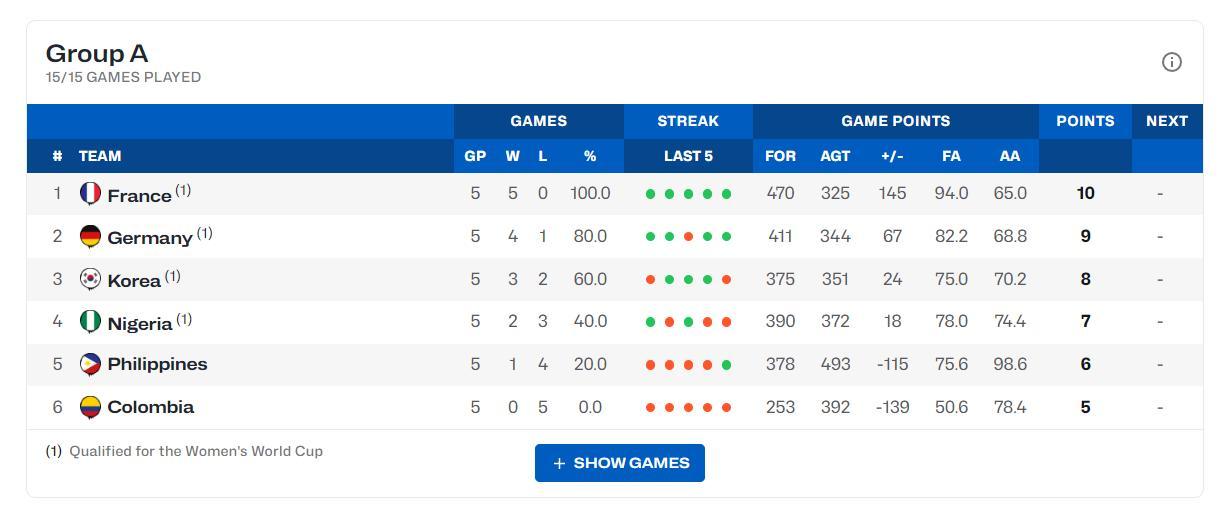 韓國隊僅輸給了兩支頂級強隊:49-76德國、62-89法國,其餘的三場比賽77-60尼日利亞、82-52哥倫比亞、105-74菲律賓。贏下的這三場比賽韓國隊的核心姜怡瑟發揮都非常出色。
