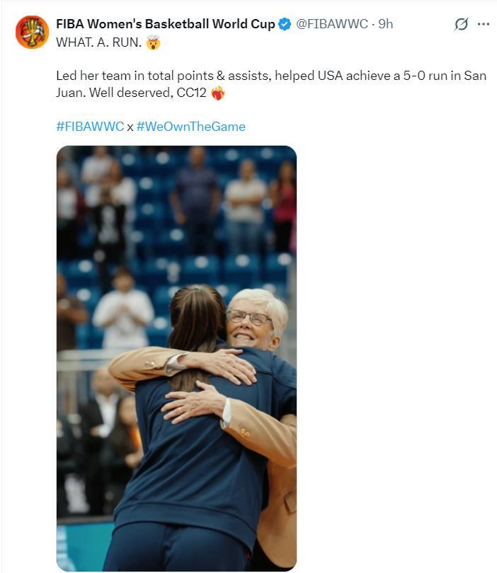 FIBA官方寫道:克拉克的總得分、總助攻都是美國女籃最多的,她帶領美國隊完成了這一波五連勝。