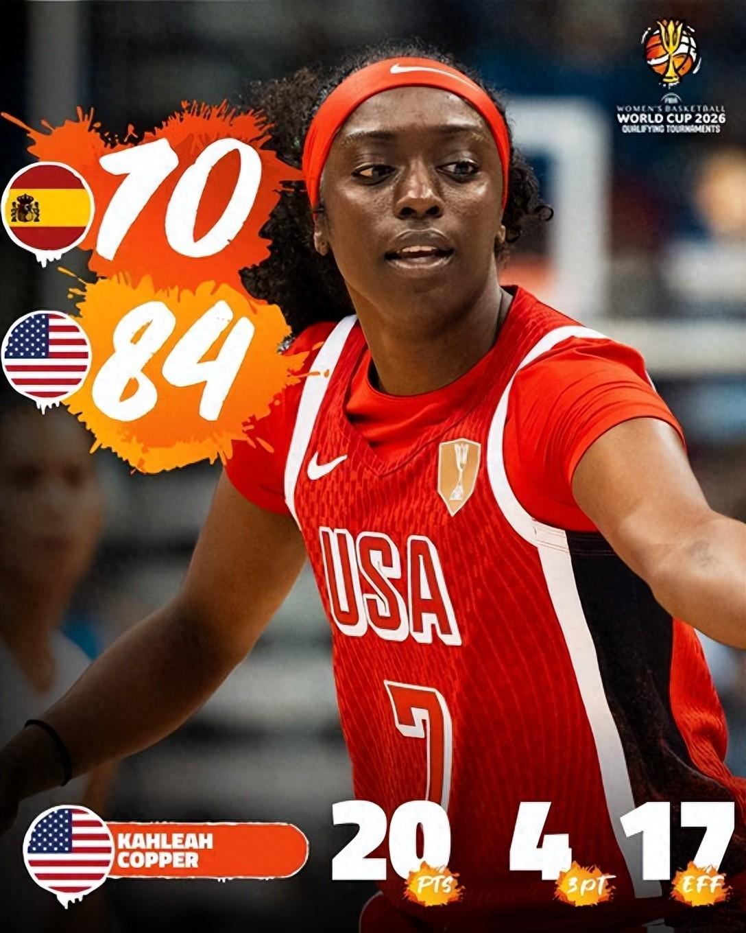 美國隊84-70大勝西班牙豪取五連勝,這場比賽庫珀全場24分鐘,12中7,三分7中4,拿到20分2籃板,普魯姆21分鐘,9中7,三分5中4拿到18分3籃板1助攻2搶斷,哈姆比10中7拿到14分7籃板2助攻,美國隊三人上雙拿下大勝。