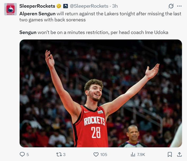 火箭官方寫道:申京在復出後拿到了兩雙數據。