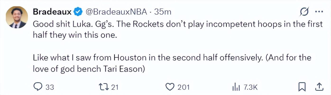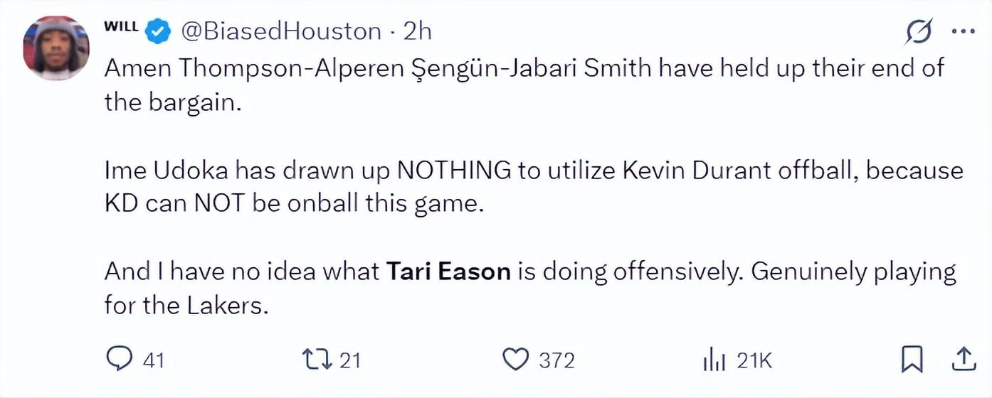 火箭記者Bradeaux:求求烏度卡,讓塔裏-伊科回替補席去吧。