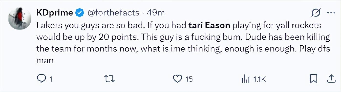 杜蘭特球迷:伊森完全是在爲湖人打球,這傢伙簡直就是一個廢物,他已經連續幾個月拖累我們了,我覺得該放棄他了,該換人上陣了,快點裁掉他吧。