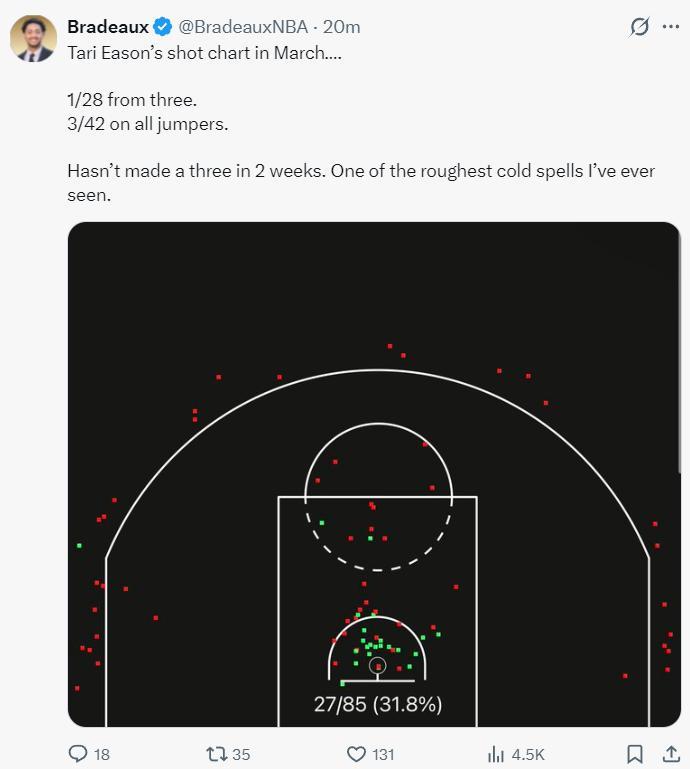 他曬出伊森三月份的投籃熱區(美國時間),三分球28中1(3.5%),跳投42中3(7.14%),伊森已經超過兩週沒有投進過三分,這是我見過最寒冷的投籃熱區圖。