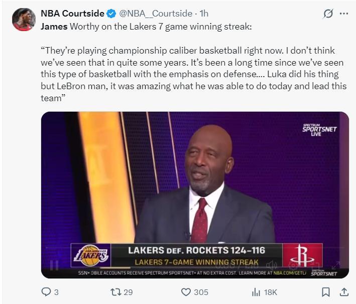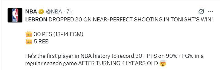 詹姆斯此役34分鐘,14中13,三分2中2,罰球3中2,拿到30分5籃板2助攻1搶斷1蓋帽,命中率92.9%,三分命中率100%,41歲的勒布朗打出如此逆天的效率讓東契奇都讚不絕口。