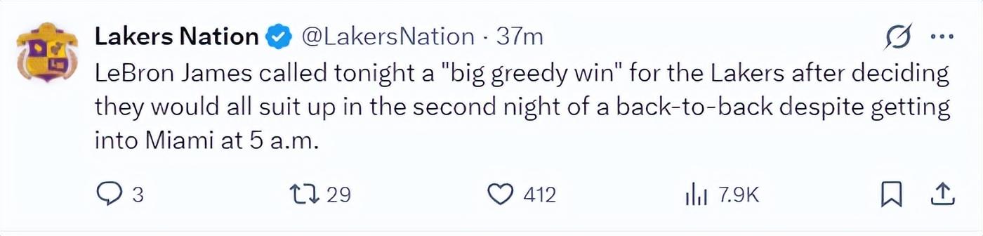 詹姆斯談到這場勝利直言來之不易,因爲全隊是凌晨5點從邁阿密出發的,背靠背第二場賽前決定全員出戰。