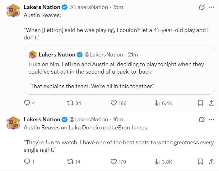 裏夫斯則談到41歲的勒布朗願意出戰背靠背第二場:這就是我們團結一心的原因,我們不可能讓一位41歲的老將去打背靠背G2而我不去打,雖然我們都可以在這場比賽中輪休,可勒布朗不想休息,那我們必然同仇敵愾的出戰。每個夜晚看他打球都是一種享受。