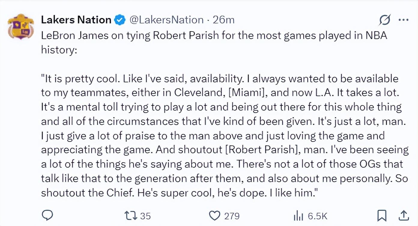 詹姆斯談追平帕裏什1611出場次數的紀錄:很棒,就像我此前說的我一直都想爲隊友提供幫助,不管是在克村、邁阿密、洛杉磯都一樣,這需要付出很大的努力與 巨大的精神力,你需要不停的參加比賽應付一切突發情況。我真的很熱愛這項運動也很感激這項運動,我想跟帕裏什擊個掌。