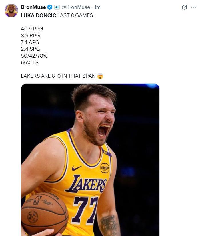 湖人是一波八連勝,這一波八連勝期間東契奇場均40.9分8.98籃板7.4助攻2.4搶斷,命中率50%,三分命中率42%,罰球命中率78%,真實命中率66%,東契奇實在是太炸裂。