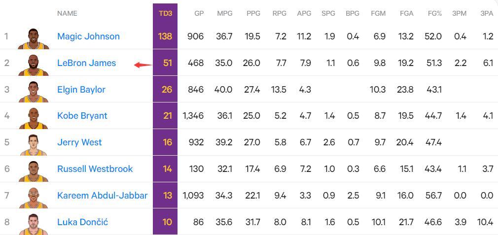 4.詹姆斯湖人隊史第51次三雙僅次於魔術師138次;