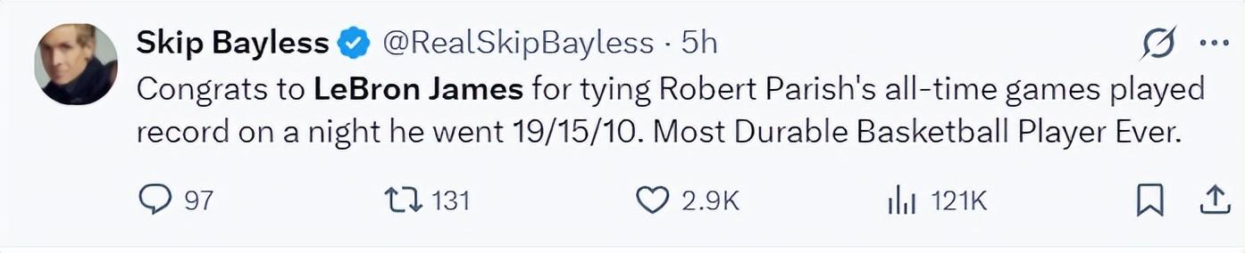 賽後最強詹黑斯利普-貝勒斯都被打服了,他寫道:恭喜勒布朗打破了帕裏什的生涯出場次數,他拿到19+15+10。他是有史以來最頑強的籃球運動員之一。