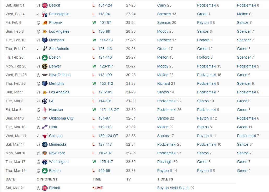 自1月31日以來勇士隊的21場比賽他們只贏了6場比賽,庫裏缺席的20場比賽輸掉了14場比賽,雖然庫裏的訓練師兼籃球表現教練布蘭登-佩恩聲稱庫裏本賽季肯定會迴歸,可目前庫裏依舊沒有確定的復出時間表。