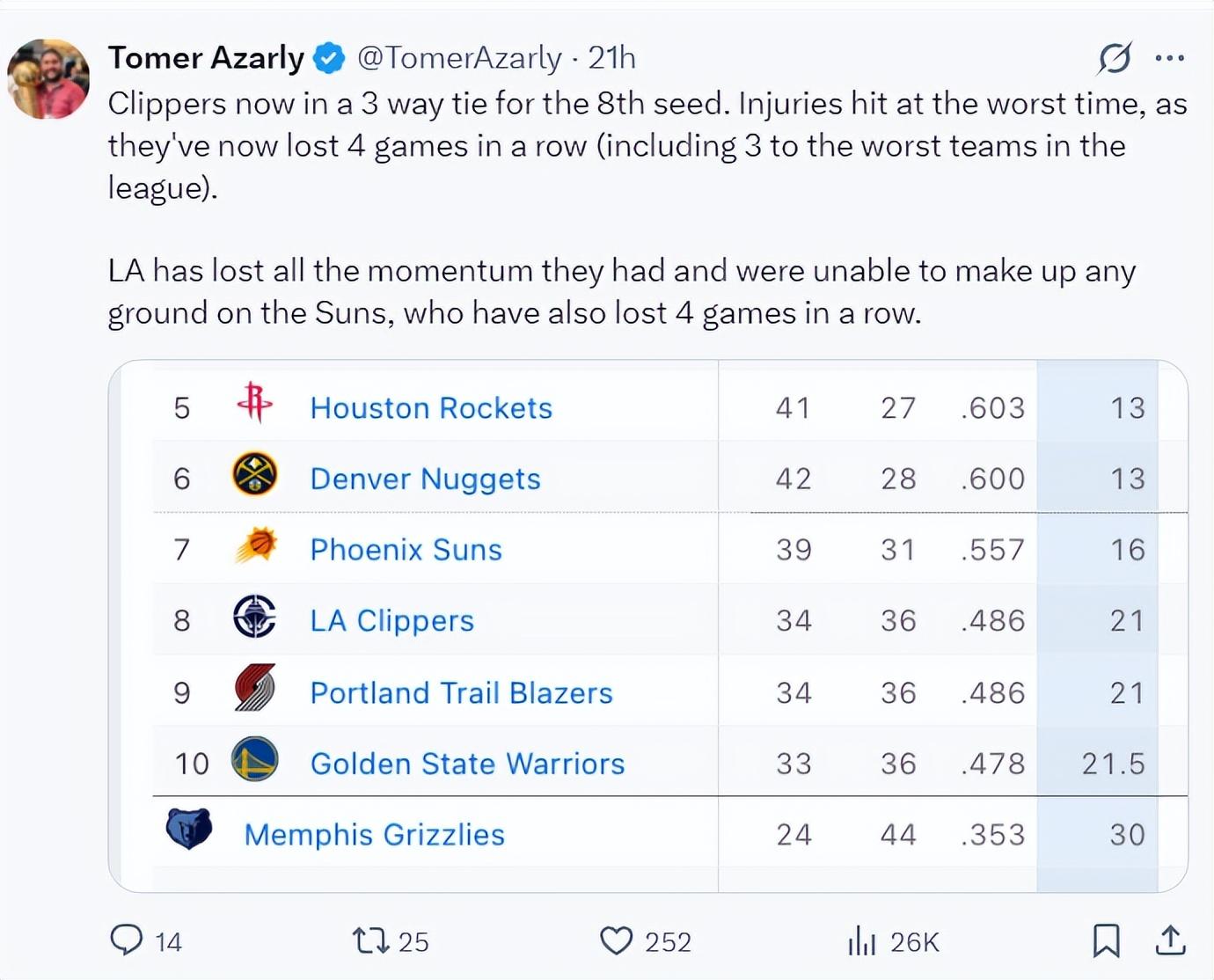 快船記者Tomer Azarly稱,快船目前的戰績跟開拓者、勇士很接近,但傷病找上了他們,目前他們正值一波四連敗還連續輸給聯盟最弱的球隊。快船已經失去了之前所擁有的全部優勢,並且已經無法跟太陽去競爭西部第七,就算太陽也是四連敗可跟快船的勝場差也有5個之多。