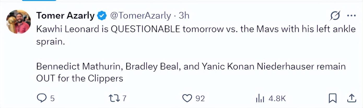 根據快船記者Tomer Azarly的報道,對陣獨行俠的比賽倫納德是出戰存疑,他的左腳踝扭傷了。馬瑟林、尼德豪澤兩人確定缺席對陣獨行俠,快船遭遇一波傷病潮。(馬瑟林腳趾傷勢、尼德豪澤右腳韌帶損傷)