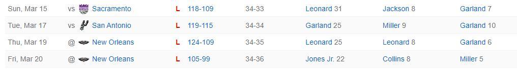 快船吞下了一波四連敗:國王、馬刺、兩次鵜鶘,要知道國王、鵜鶘都已經是擺爛的球隊,快船也因爲這一波四連敗戰績34勝36負被開拓者追平勝場差,小卡對陣國王、鵜鶘一番戰都出場了可就是無法取得勝利。