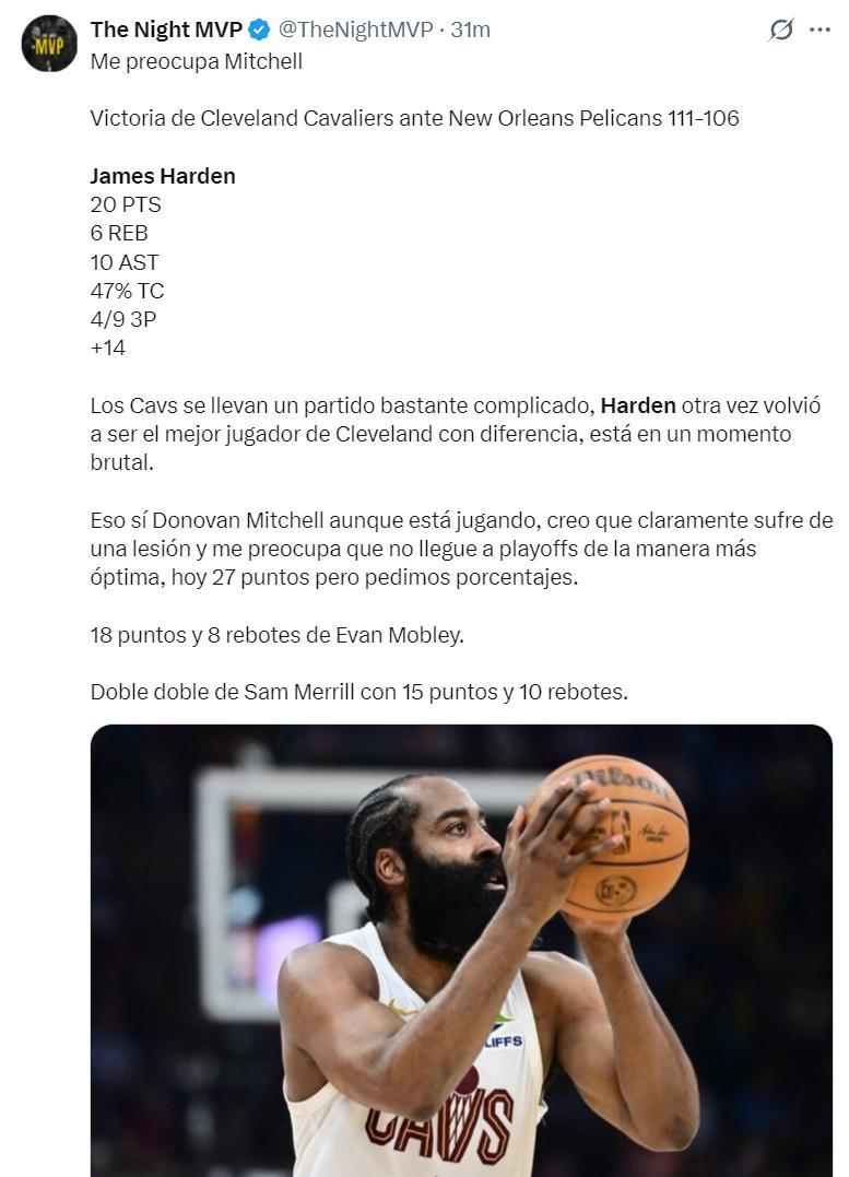 美媒TNM寫道:騎士打了一場很艱難的比賽,哈登再次成爲克利夫蘭最出色的球員,米切爾雖然登場了但我覺得他的傷還沒有痊癒,我擔心他不能以100%的狀態進入季後賽。