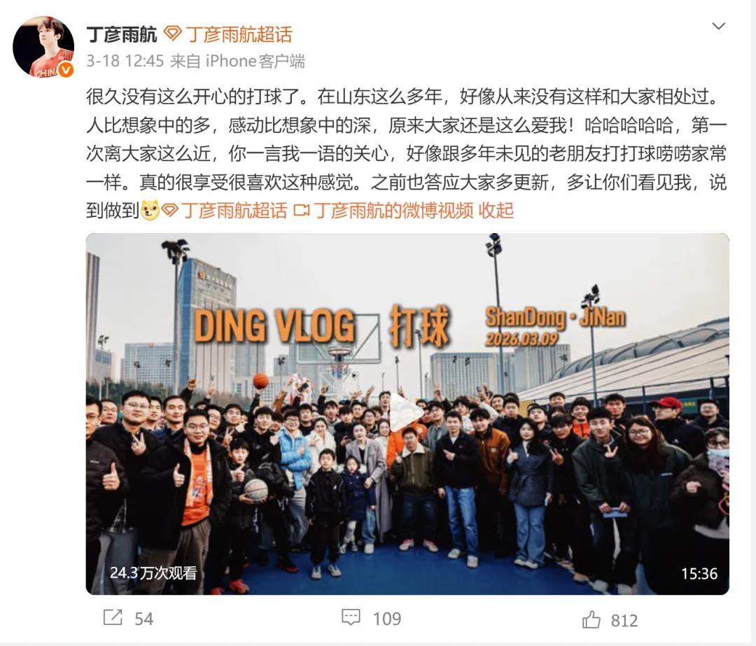 夜色籠罩山東高速球館,丁彥雨航一個人回來了。