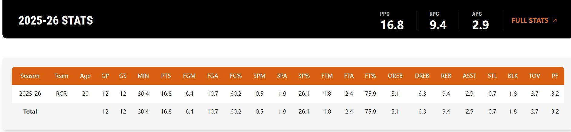 楊瀚森在G聯賽的12場比賽,場均30.4分鐘,拿到16.8分9.4籃板2.9助攻0.7搶斷1.8蓋帽,命中率60.2%,三分命中率26.1%,他的短板依舊是中遠投射。