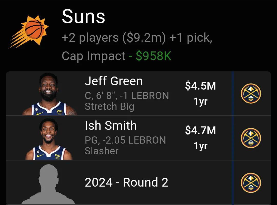 掘金送出傑夫-格林、伊斯梅爾-史密斯、2024年次輪籤,從太陽隊得到克勞德。
