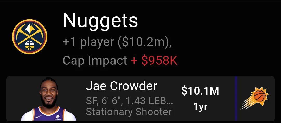 太陽一直在兜售克勞德,但沒有得到更好的交易報價,掘金送出傑夫-格林、伊斯梅爾-史密斯和1個次輪,能讓太陽得到兩位輪換球員和一個次輪選秀權的回報,不至於等到克勞德明年夏天合同到期後自己走人。
