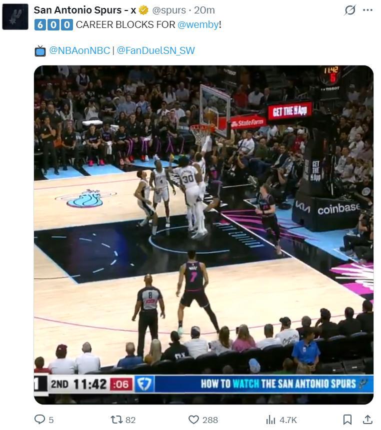 第二節開場文班亞馬就完成了生涯第600個封蓋,他協防端送出護筐,這就是外星人的能力,首節2分3籃板1蓋帽,第二節完成第一個蓋帽後達成600+封蓋里程碑。