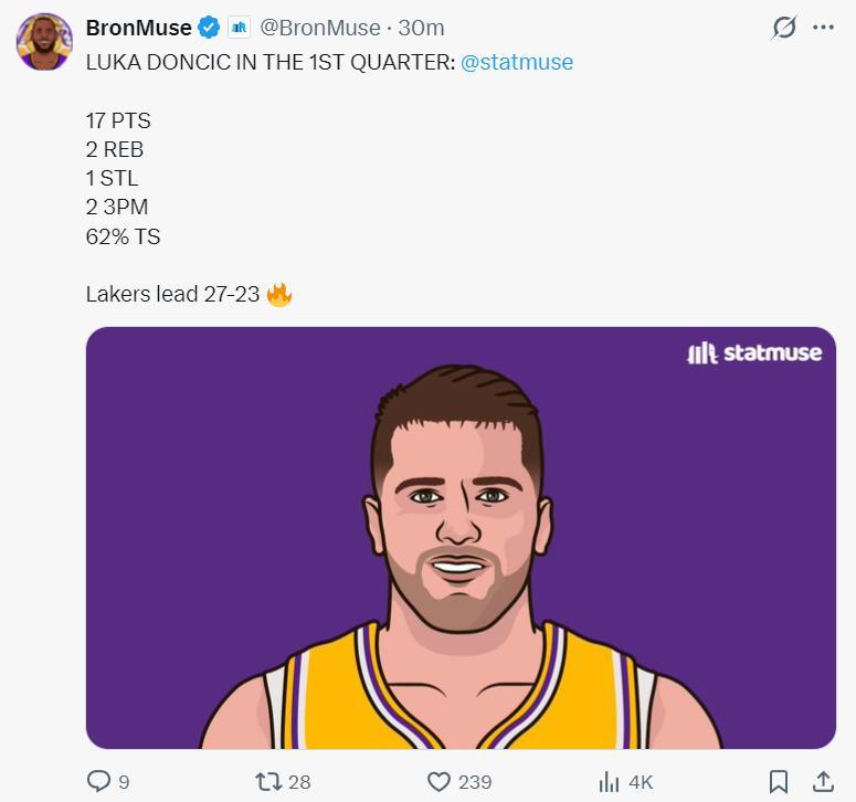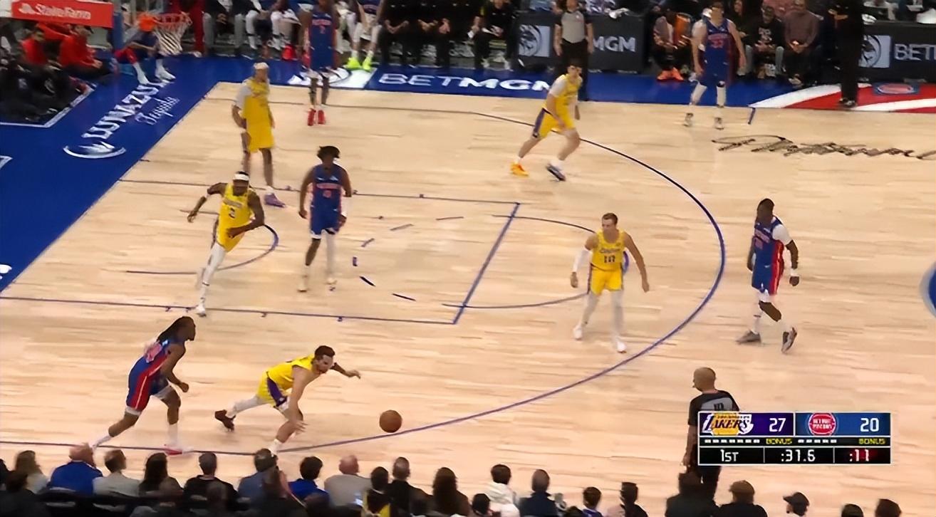首節東契奇居然爲了球權飛撲到場外,也是這次飛撲導致他的腿部不適下場處理,但他首節11中5+三分7中2拿到17分2籃板1搶斷,他一人支撐了湖人的進攻,湖人全隊首節只拿27分而已。