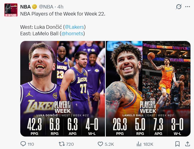 賽前東契奇成爲西部周最佳,他上週場均42.3分6.3助攻帶隊4勝0負,實際上湖人一波九連勝期間東契奇場均也超過40分比肩張伯倫。