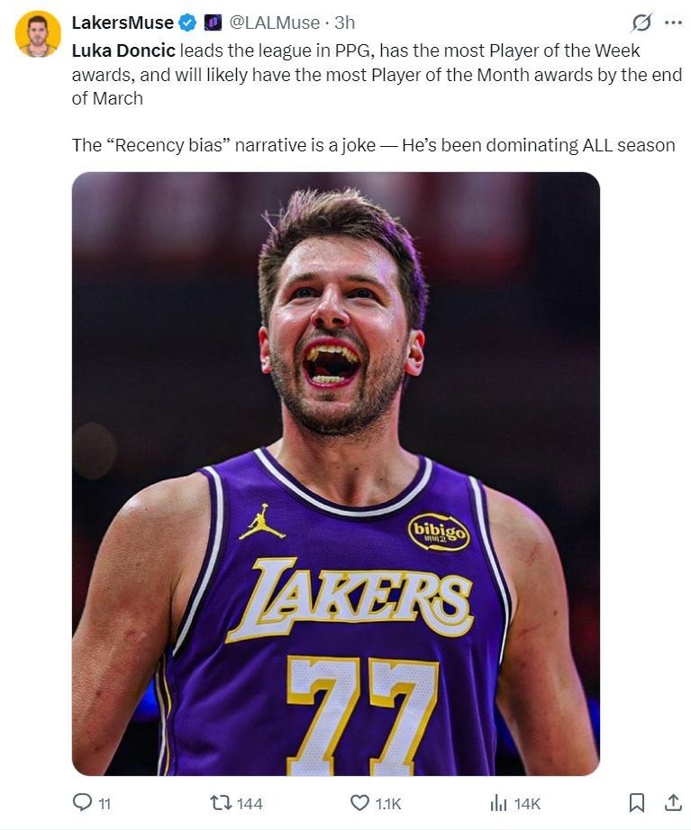 湖媒寫道:東契奇得分榜領跑聯盟,他獲得周最佳球員最多,但三月底後他獲得月最佳的次數也可能是最多的。“近因效應偏差”這種說法簡直是個笑話,他整個賽季都處於主導地位。