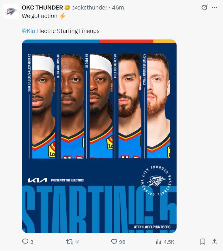這場比賽雷霆迎來了他們久違的奪冠先發陣容:SGA、傑威、多爾特、霍姆格倫、哈騰,這套先發的攻防能力都非常恐怖。亞歷山大的進攻壓力就減小了很多,上一場對陣奇才SGA爆砍40分,而此役SGA首節只有8分1籃板1助攻1搶斷1蓋帽,傑威2分2助攻,霍姆格倫5分3蓋帽2助攻,哈騰4分2籃板1助攻1搶斷。