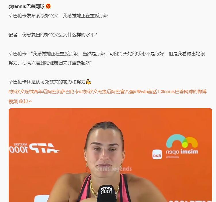 賽後薩巴倫卡談到鄭欽文的表現,她表示:感覺鄭欽文正在重返頂級,當然是最頂級,可能她今天的狀態不是太好,我看出她很努力,很高興能看到她健康歸來並且重新起航。
