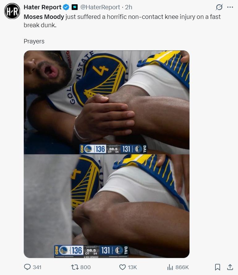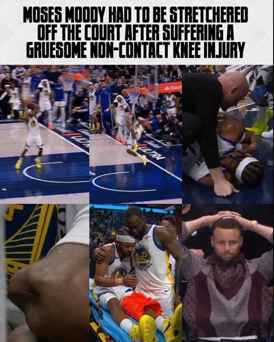 北京時間3月24日,剛剛傷愈復出的摩西-穆迪再度遭遇了毀滅性的傷病,他在加時賽一次快攻中無對抗左膝反關節,場面觸目驚心勇士與獨行俠的一些球員甚至看哭了,庫裏戴着大金錶捂頭沮喪。