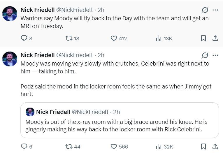 勇士記者尼克-費爾德透露,穆迪在接受完X光檢查後,他已經開始拄拐一瘸一拐的行走,他跟裏克-塞萊布里尼一起,他的左膝已經戴上厚厚的護具來固定。