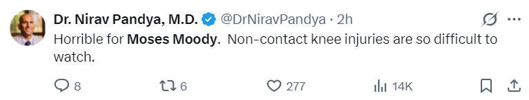 運動醫學專家Nirav Pandya直言:這對穆迪來說是糟糕透頂的傷病,非接觸的膝蓋傷勢太令人揪心了。