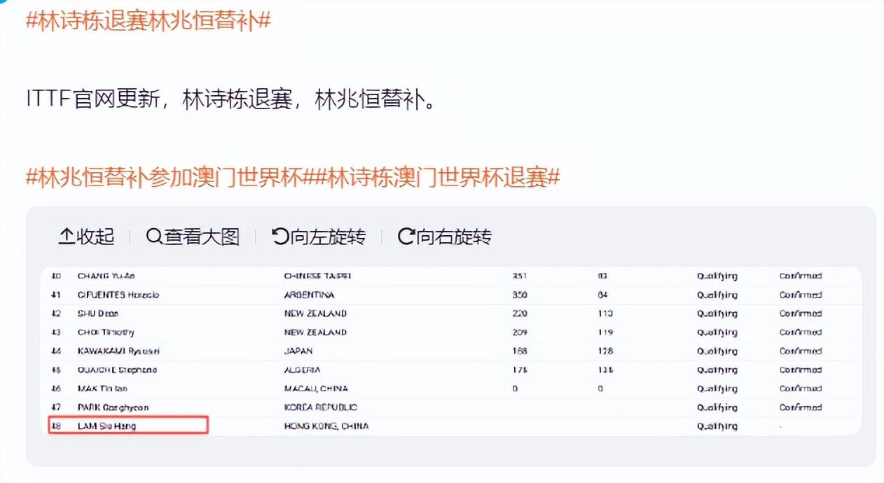 根據世界盃的規則,在林詩棟退賽後,將由該洲際盃賽中排名最高、止步八強的選手遞補參賽,所以中國香港選手林兆恆以亞洲盃八強的身份獲得替補資格。所以中國隊只能以4位選手出戰:王楚欽、梁靖崑、周啓豪、溫瑞博。