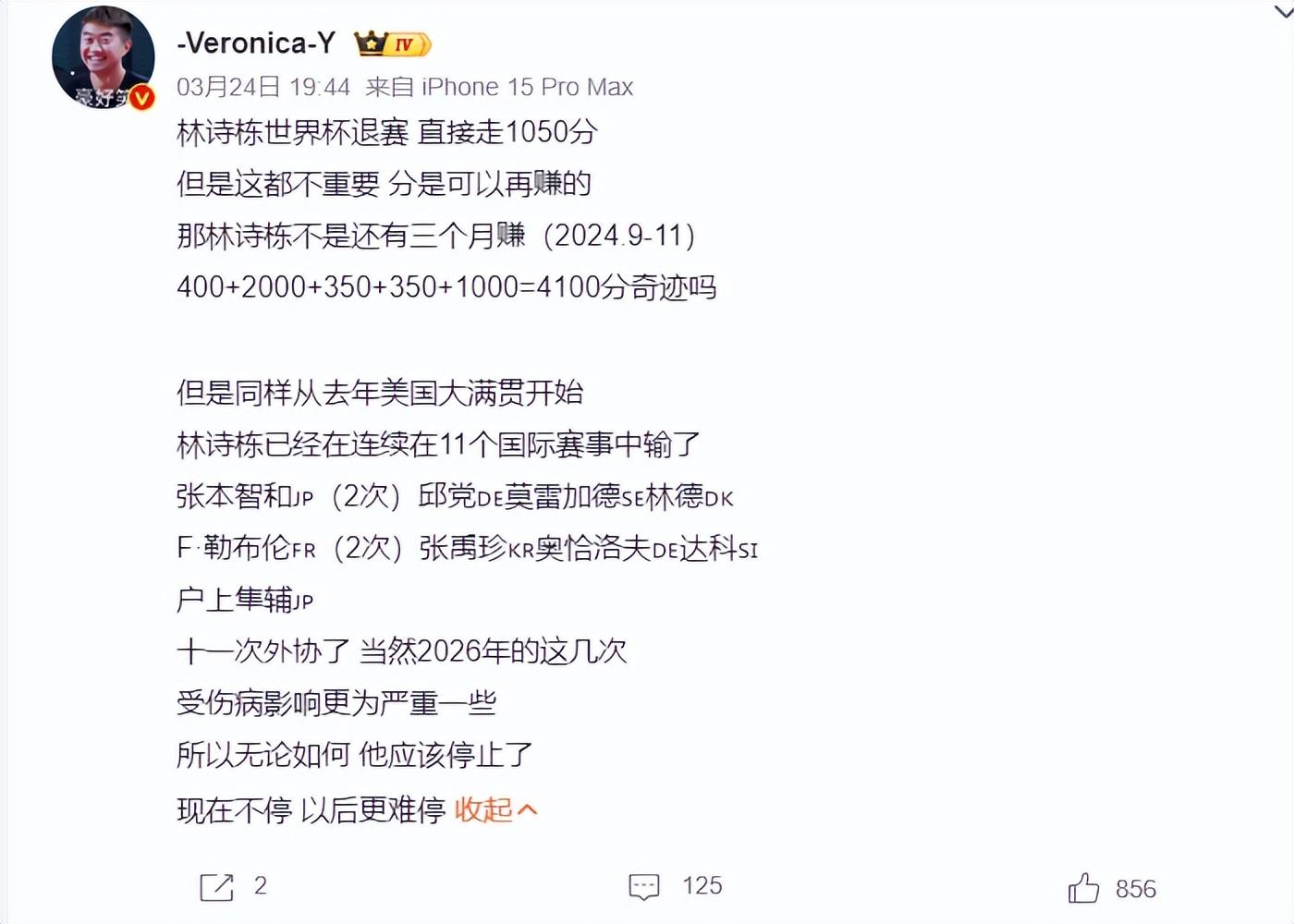 根據大V所說,自2025年美國大滿貫後林詩棟已經連續11屆國際賽事輸給外協:張本智和(2次)、小勒布倫(2次)、邱黨、莫雷高德、林德、張禹珍、奧恰洛夫、達科、戶上隼輔。