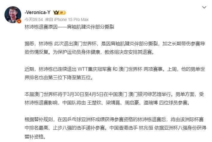 林詩棟已經確定退出2026年澳門世界盃,世界盃在3月30日就要開打、據悉,林詩棟因爲肩袖肌腱炎伴部分撕裂、膝蓋不適等傷病,加之長期帶傷參賽導致傷情反覆。爲保護運動員身體健康,教練組決定安排其退賽。