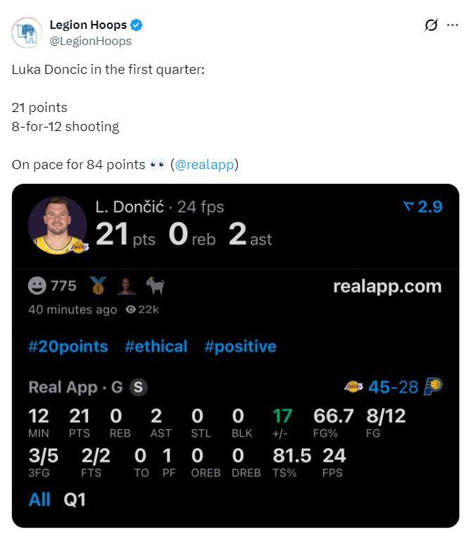 東契奇首節的手感非常好,尤其是他外線開了後就防不住了,單節12分鐘,12中8,三分5中3,罰球2中2,拿到21分2助攻,命中率66.7%,三分命中率60%,真實命中率81.5%,正負值+17。