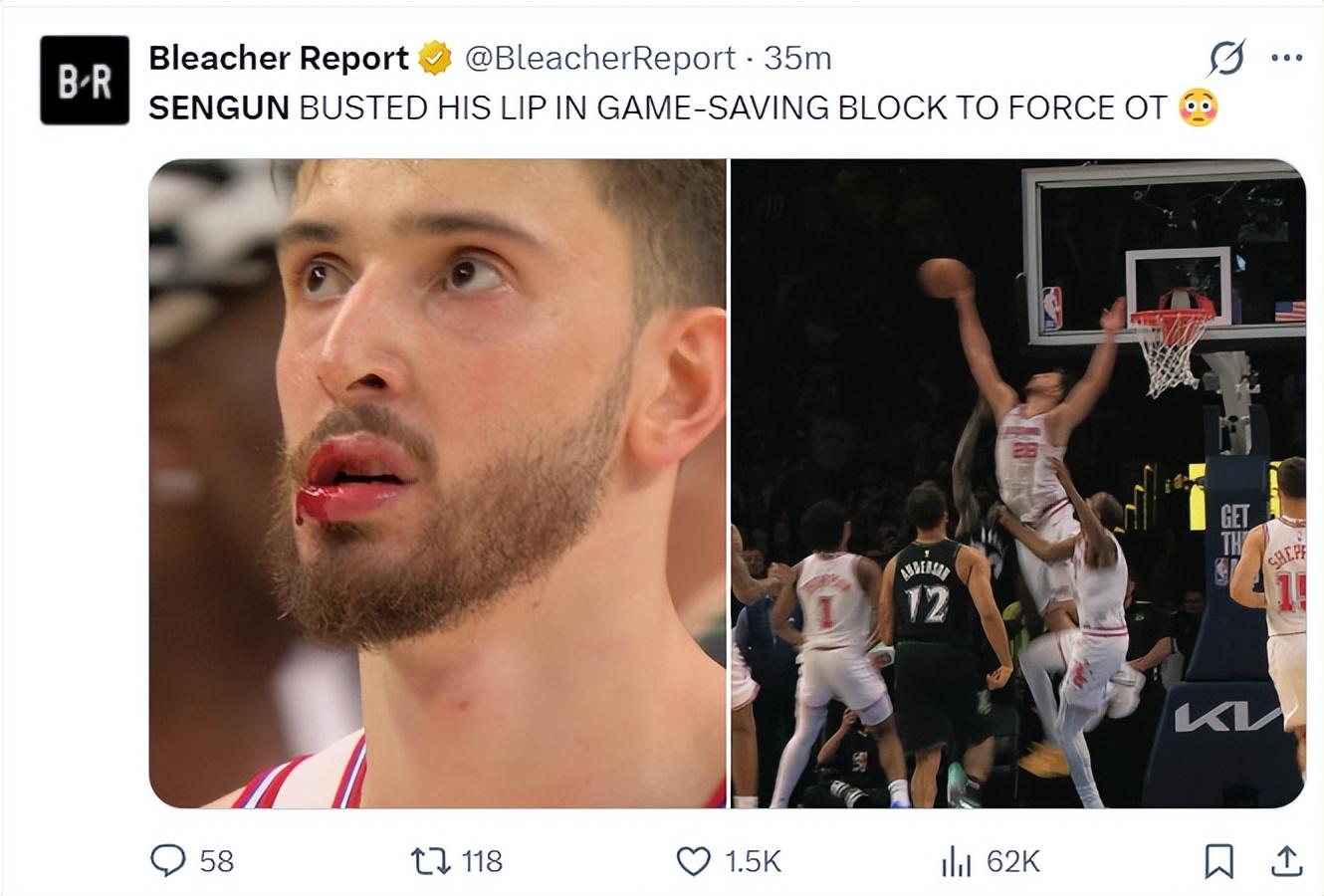 申京下落時是腦袋先着地,他的嘴脣直接裂開了,鮮血在空中飛舞,申京搖搖頭下場處理傷口。加時賽申京剛剛處理了傷口立馬再度送出大帽,火箭反擊起勢直接反超,火箭加時賽一波13-0。