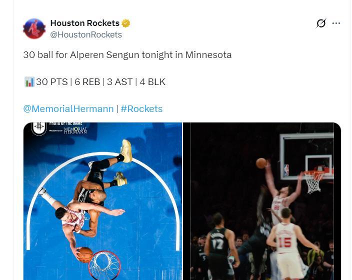 申京全場比賽43分鐘,22中12,那大30分6籃板3助攻4蓋帽5犯規,命中率54.5%,申京連續兩場比賽拿到30+的數據火箭都輸了,而且都輸的非常可惜。