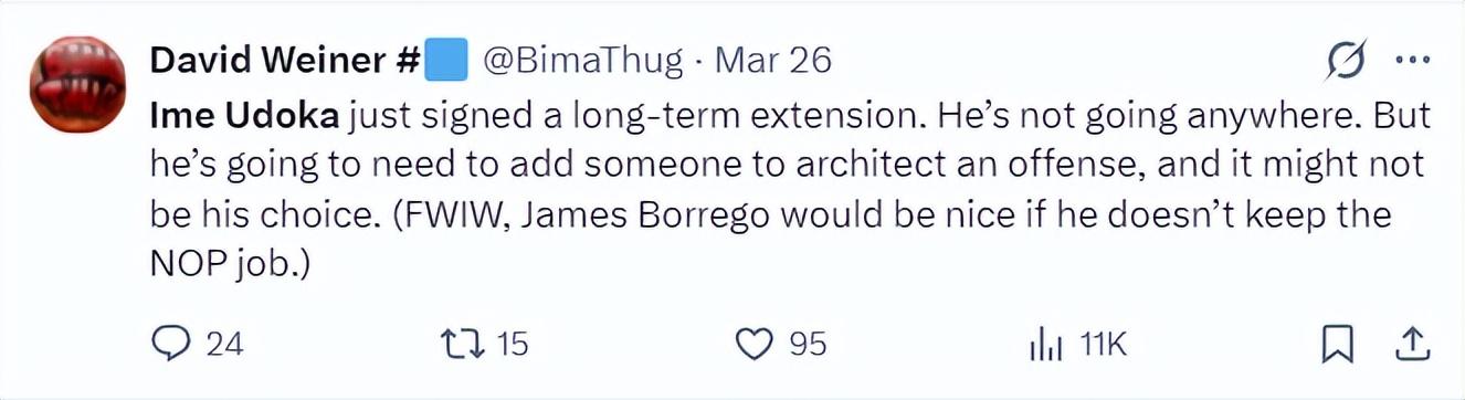 火箭記者大衛-韋納:火箭隊剛剛跟烏度卡續約了長約,火箭不會解僱他。但火箭隊的確需要人來幫助烏度卡設計進攻戰術,這個人肯定不能是烏度卡,如果鵜鶘解僱了博雷戈,那麼博雷戈是一個不錯的人選。