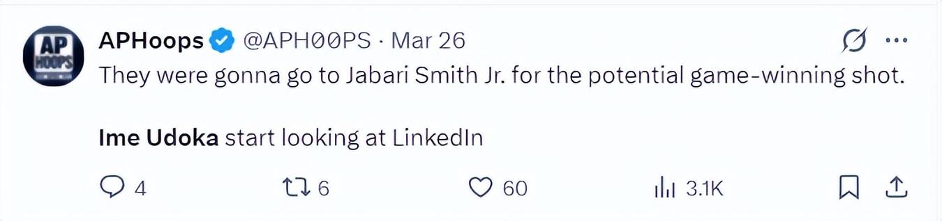 美媒APHoops透露,火箭隊本打算讓小賈巴里來投可能決定比賽勝負的關鍵一球。(可最終是杜蘭特來執行,戰術紊亂)