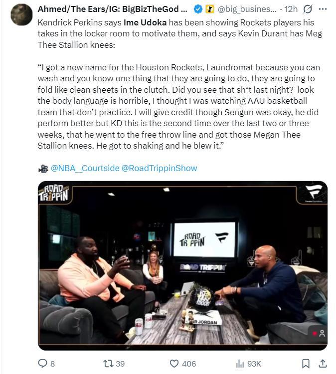帕金斯在播客節目中談到烏度卡與火箭隊,他表示:你們看到火箭VS森林狼那場比賽他們的肢體語言糟糕透頂,我還以爲自己看到了一支沒有訓練過的AUU籃球隊比賽。不過還是要給申京點贊他的表現很好,他非常強硬。可杜蘭特卻丟了最關鍵的罰球,他的表現也很拉胯。