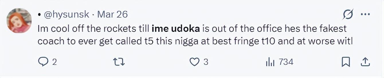 火箭球迷:烏度卡這個傢伙就像個假教練,他居然自稱是“T5”級別的教練,最差也是“T10”級別,他也說得出口。