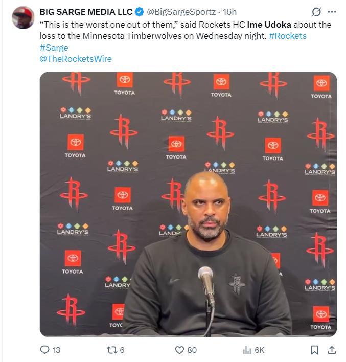 北京時間3月26日,火箭被森林狼逆轉的賽後,烏度卡是這樣評價這場比賽:這是他們本賽季表現最差的一場比賽。(烏度卡這個言論引發了熱議,因爲他又把自己的問題給拋開了)