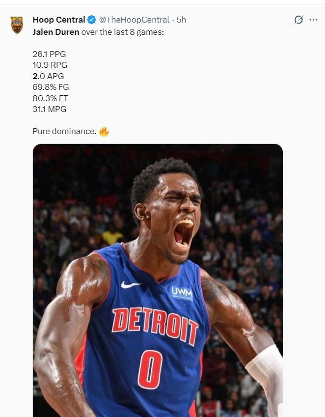 最近的八場比賽杜倫場均31.1分鐘,拿到26.1分10.9籃板2助攻,命中率69.8%,罰球命中率80.3%,換言之有沒有坎寧安他都已經蛻變。
