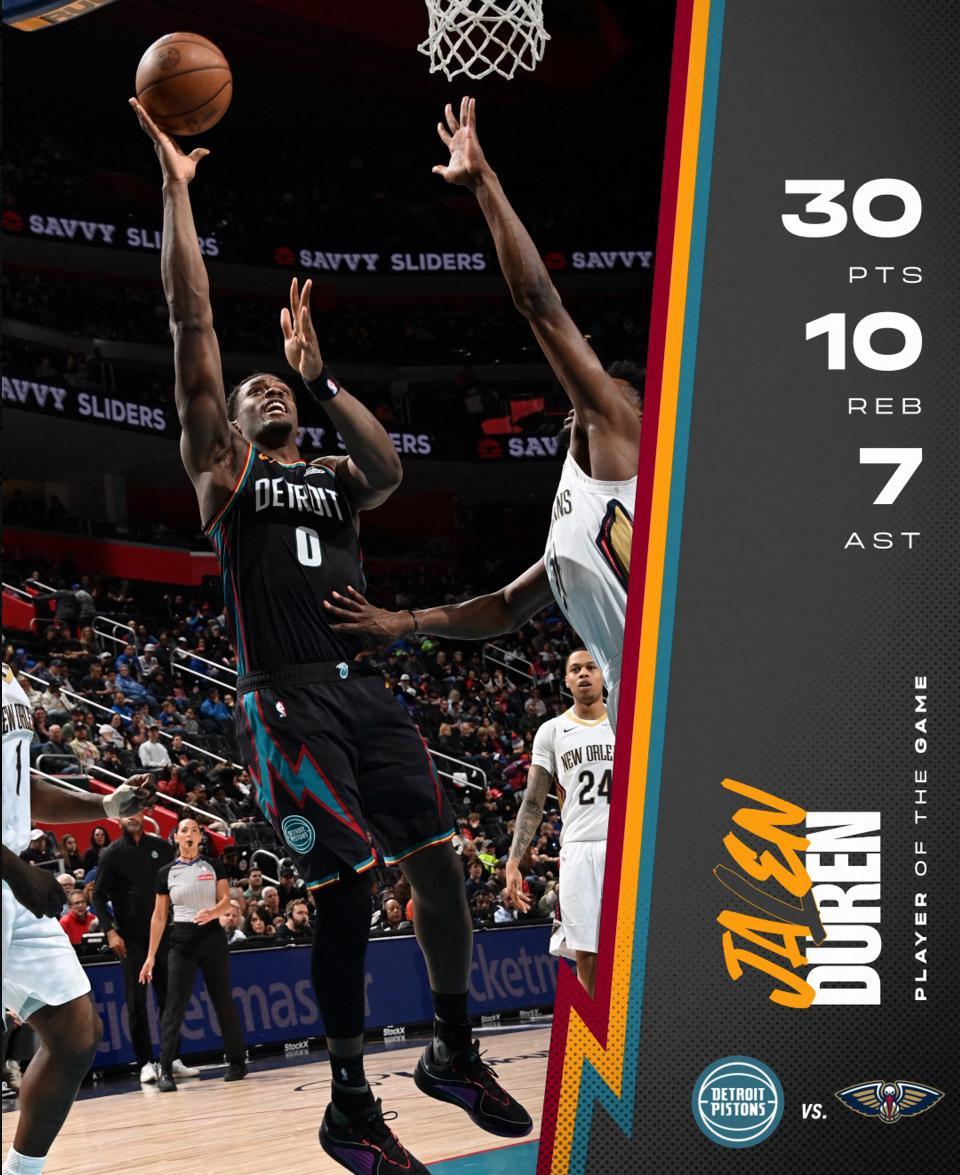 杜倫全場比賽31分鐘,12中10,罰球12中10,拿到30分10籃板7助攻2搶斷2蓋帽,命中率83.3%,真實命中率86.8%,正負值+5。杜倫作爲中鋒此役得分、籃板、助攻、蓋帽都是活塞最高的存在。