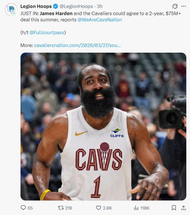 賽前報道哈登將拒絕執行下賽季的球員選項,他將與騎士重籤一份兩年7500萬的合同,第二年是球員選項。